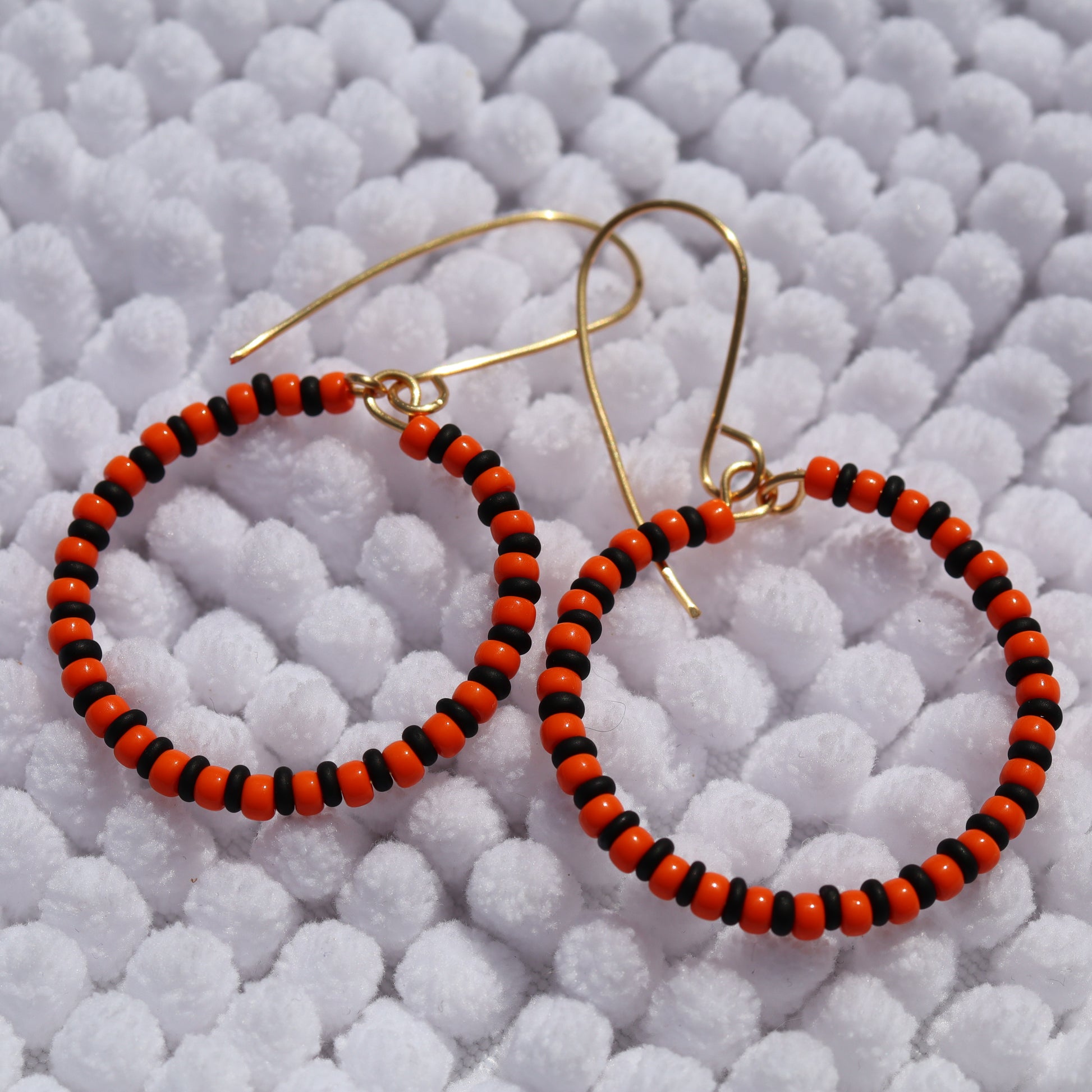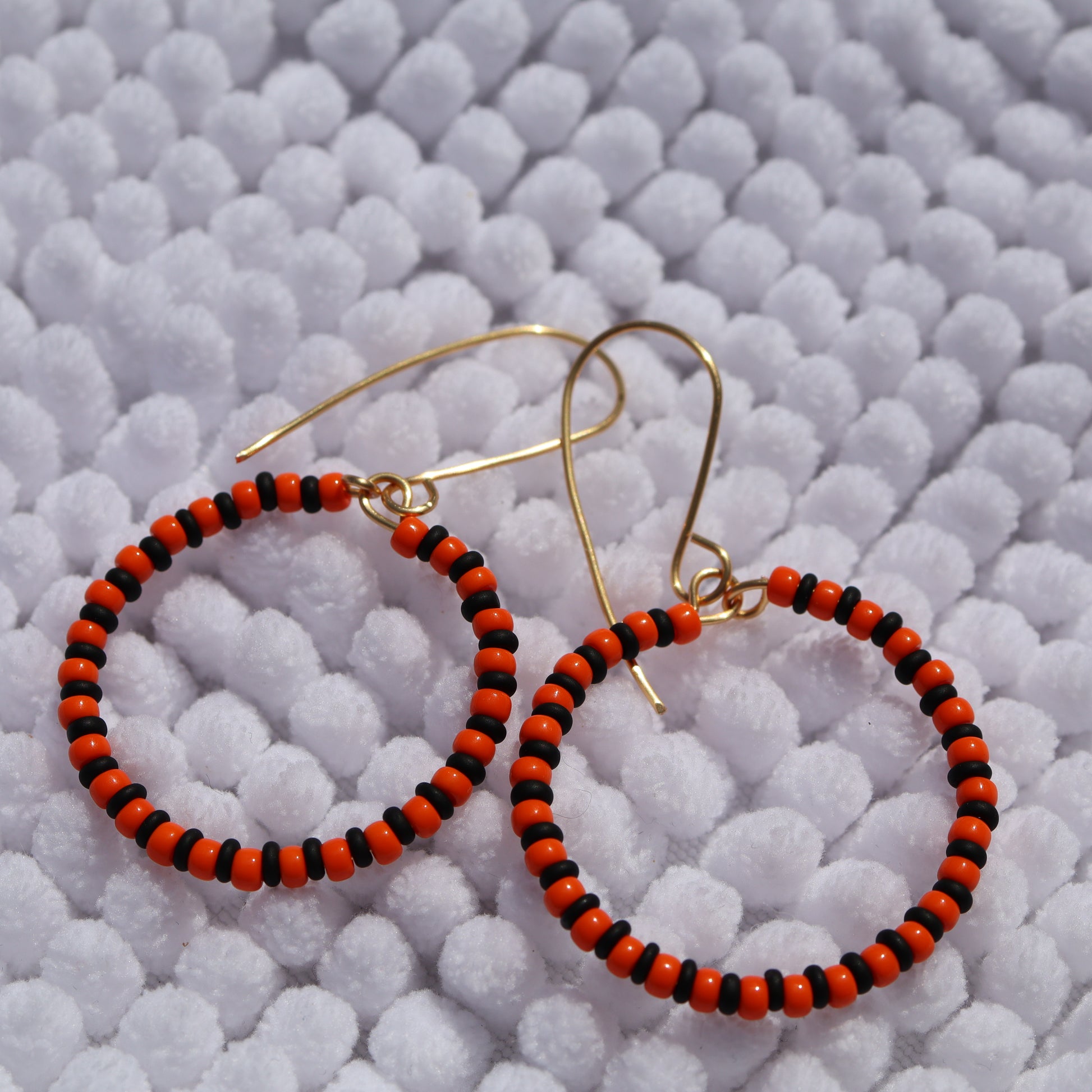 Our signature Lolita front facing hoops in orange and black for spooky season! Glass beads on gold plated wire with rubber gaskets to secure them as you go about your day.