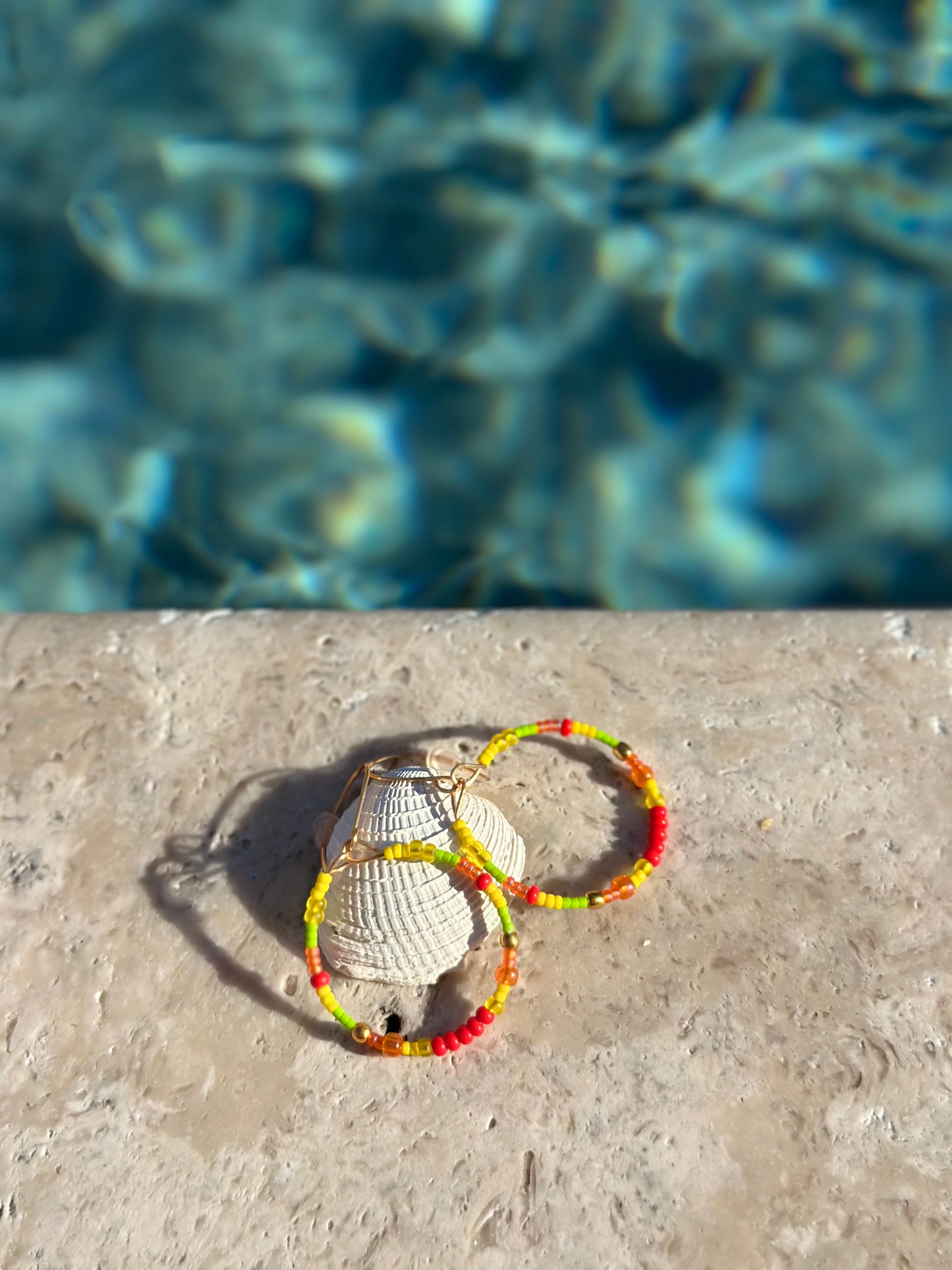 This playful, modern take on a hoop features bright glass beads on gold plated wire with gold highlight beads. They are front facing hoops that are handmade and have a rubber stopper in the back.