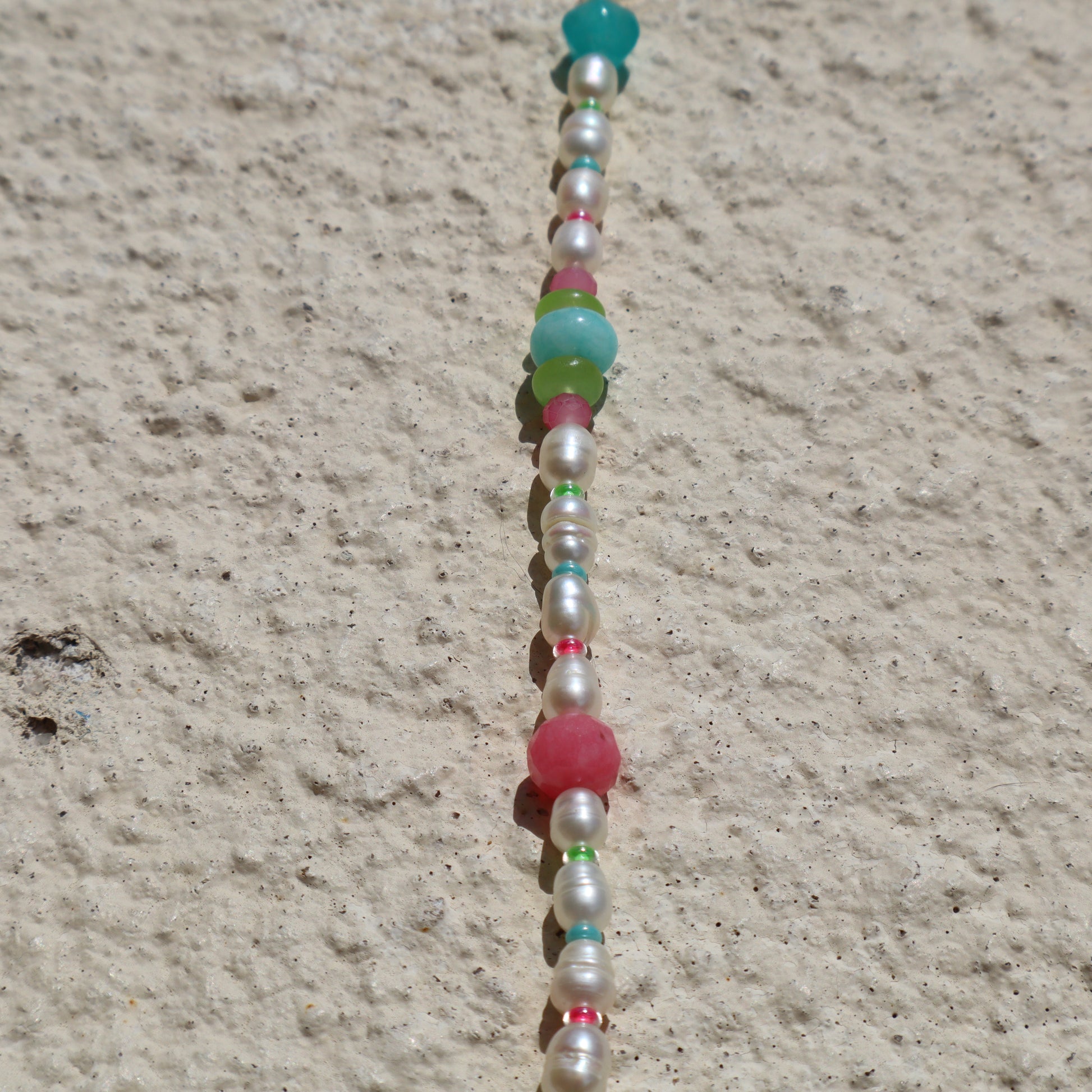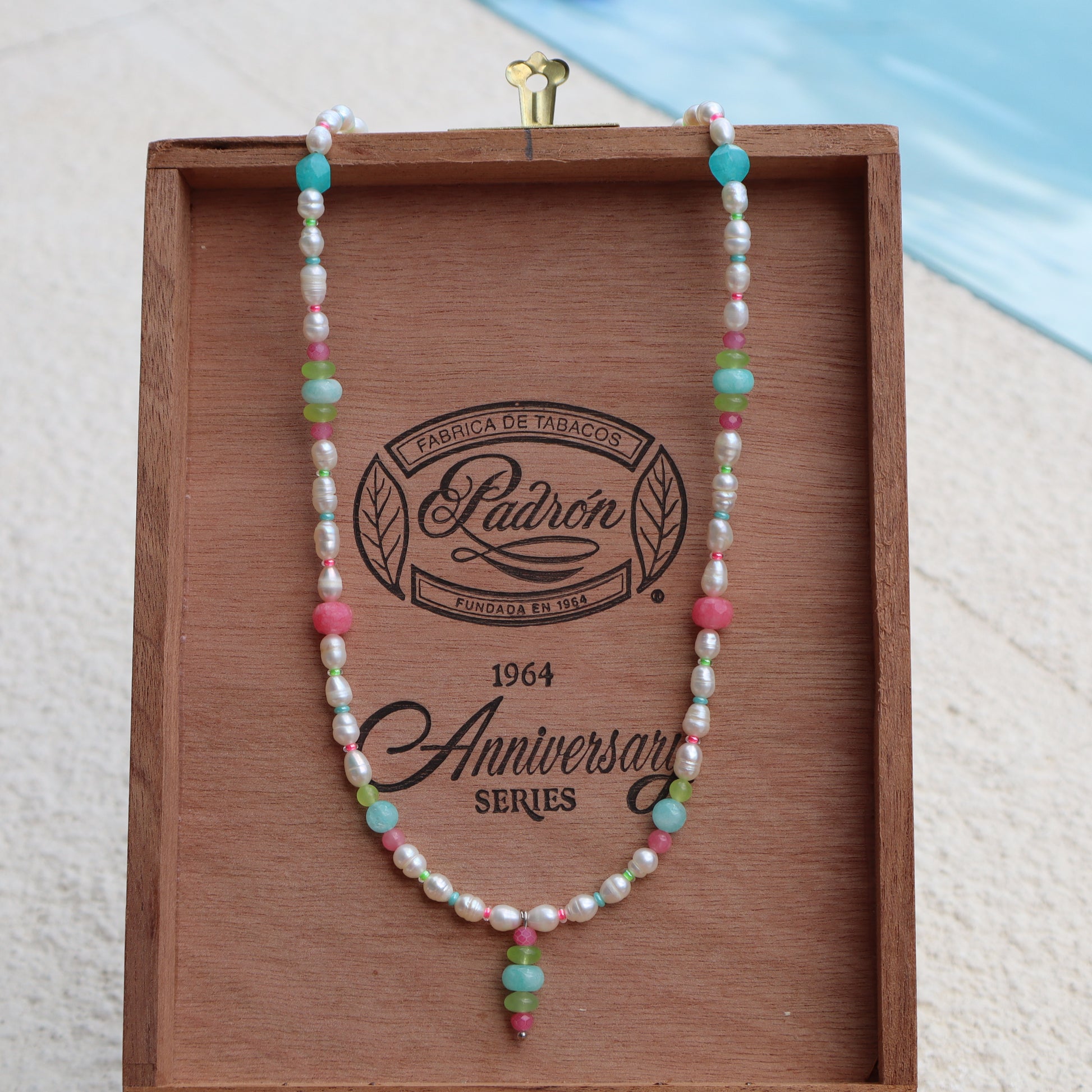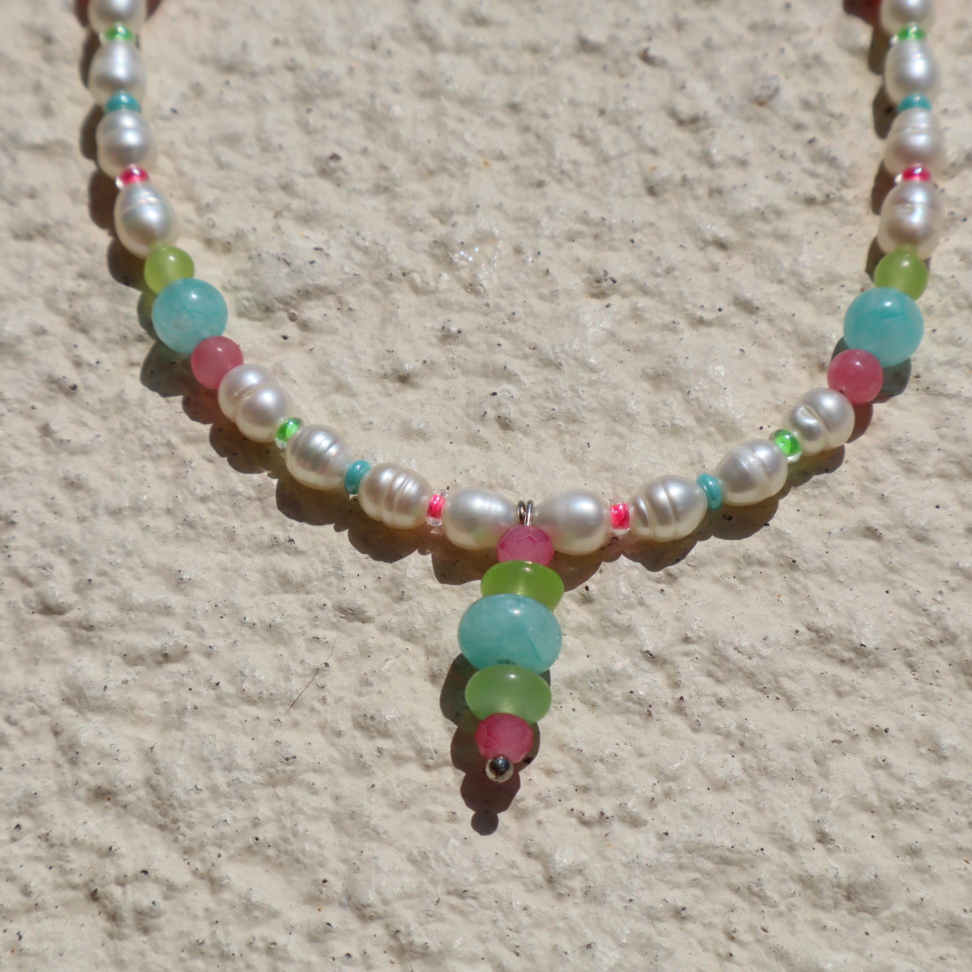 The Martinique Necklace’s bright gemstones evoke memories of fun days at the beach and adventures on vacation. It features a handmade pendant, Freshwater pearls, delicate glass spacers, and lively gemstones. It’s long length makes it perfect for layering or as a statement piece.
